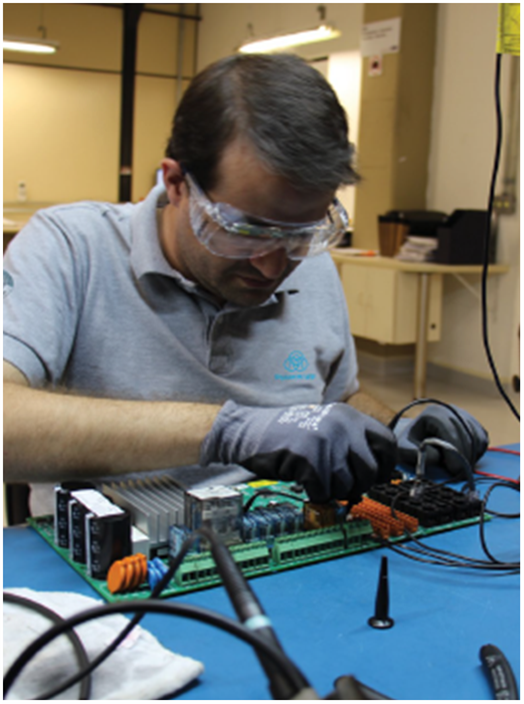 Centro técnico de avaliação de inversores de frequência com teste de desempenho de carga e sistema de frenagem.